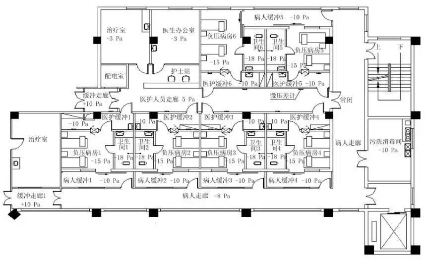 負壓程度由高到低依次為衛生間、負壓隔離病房、病人走廊、緩沖間、醫護走廊、醫生辦公室。這也有別于以往負壓病房的設計,應該以整個負壓隔離病房區作為污染受控隔離對象,在此基礎上進行壓差控制,更有利于防止污染物的擴散。有壓差要求的相鄰場所,在相通的門口目測高度安裝微壓差計。